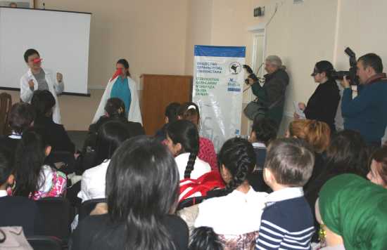 После того, как дети, родители и учителя рассмотрели рисунки на стенде, все гости были приглашены в актовый зал, в котором и началась основная программа презентации. Для всех собравшихся 55 человек в начале было показано слайдшоу рисунков, выполненных детьми, а позже члены клуба "Phasianus" представили зрителям небольшую костюмированную сценку, в которой рассказали короткие истории о птицах, которых люди спасли в разных странах.